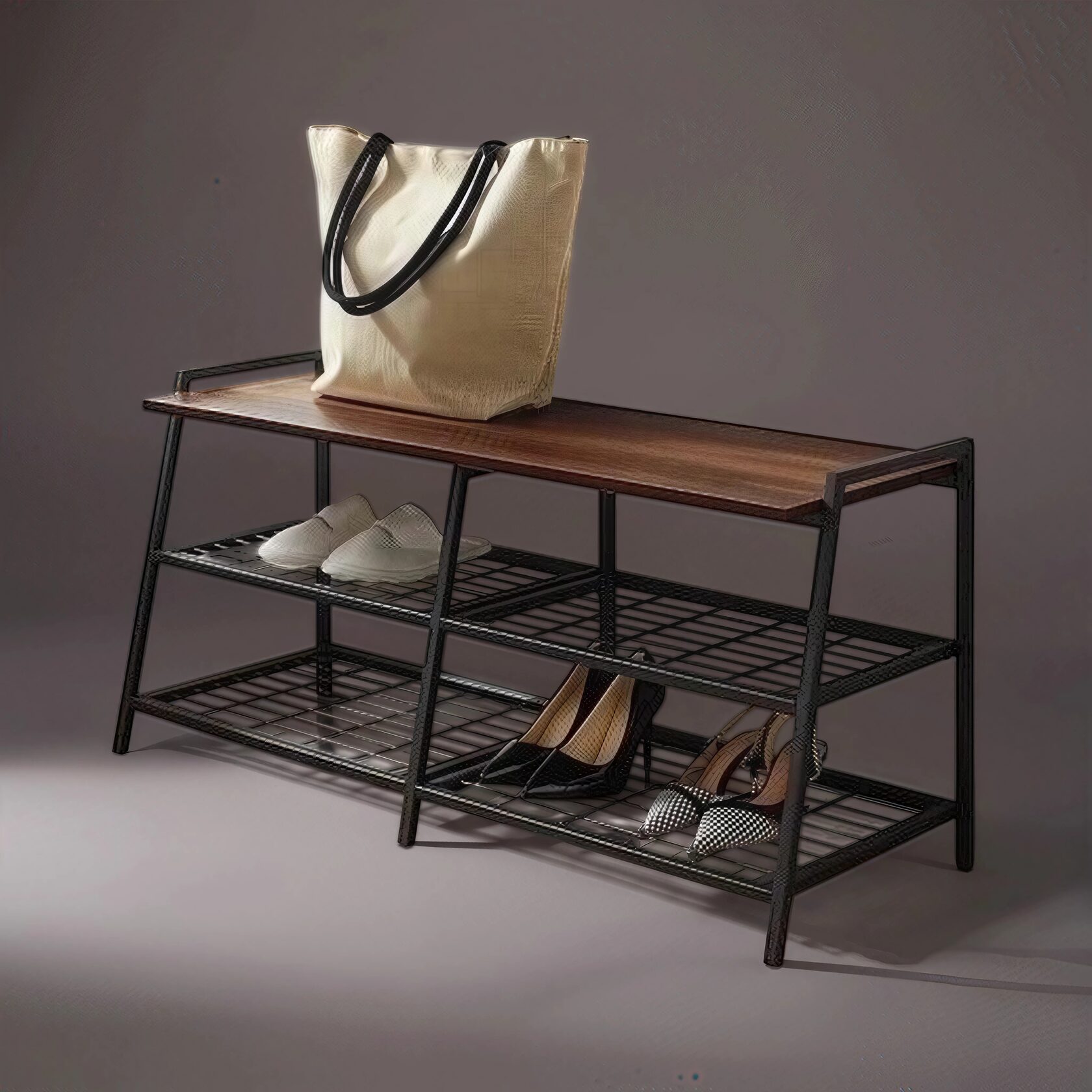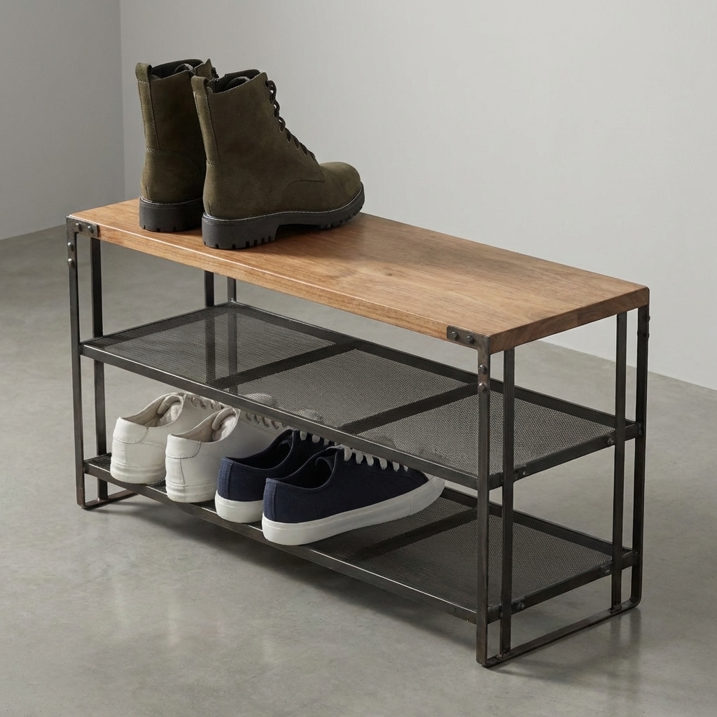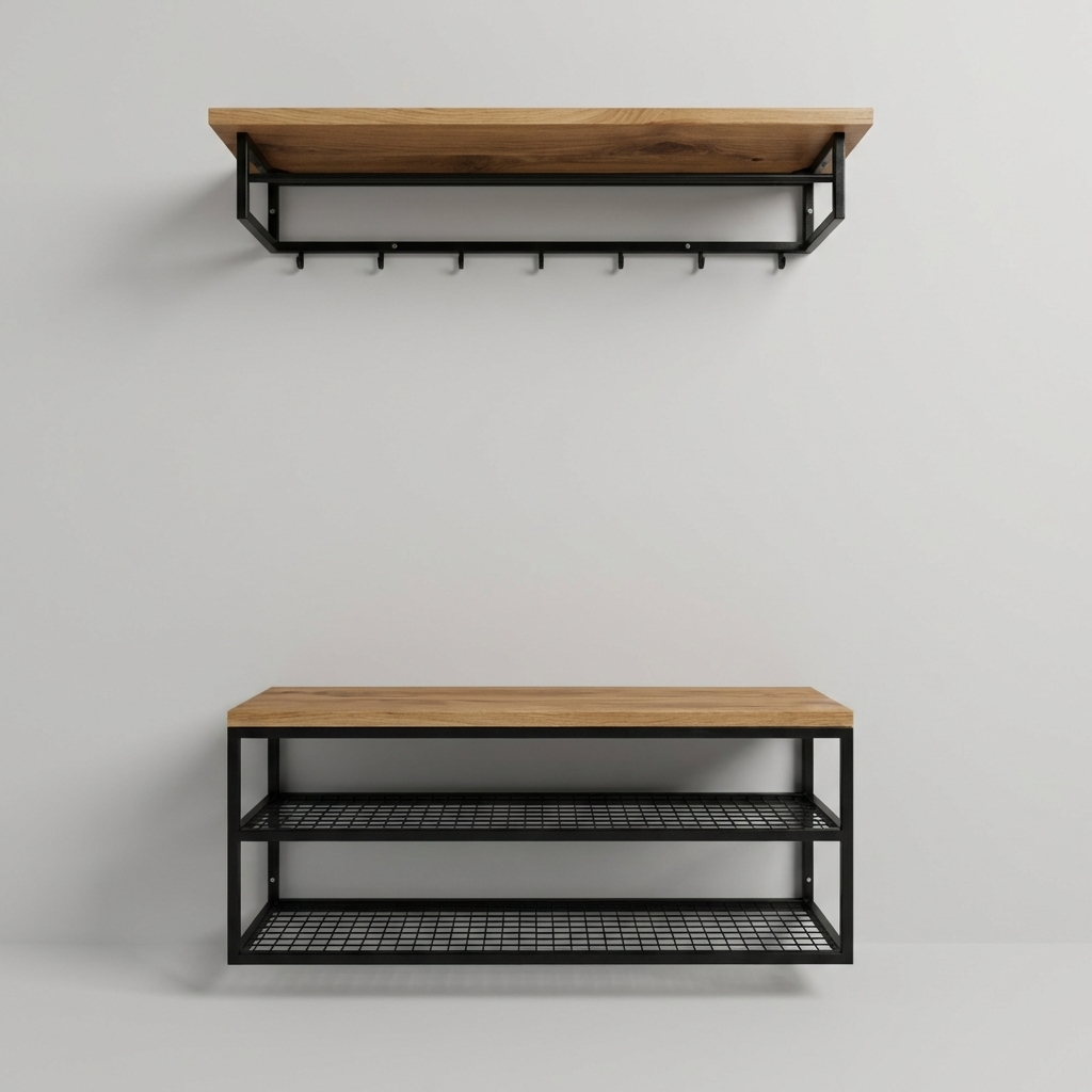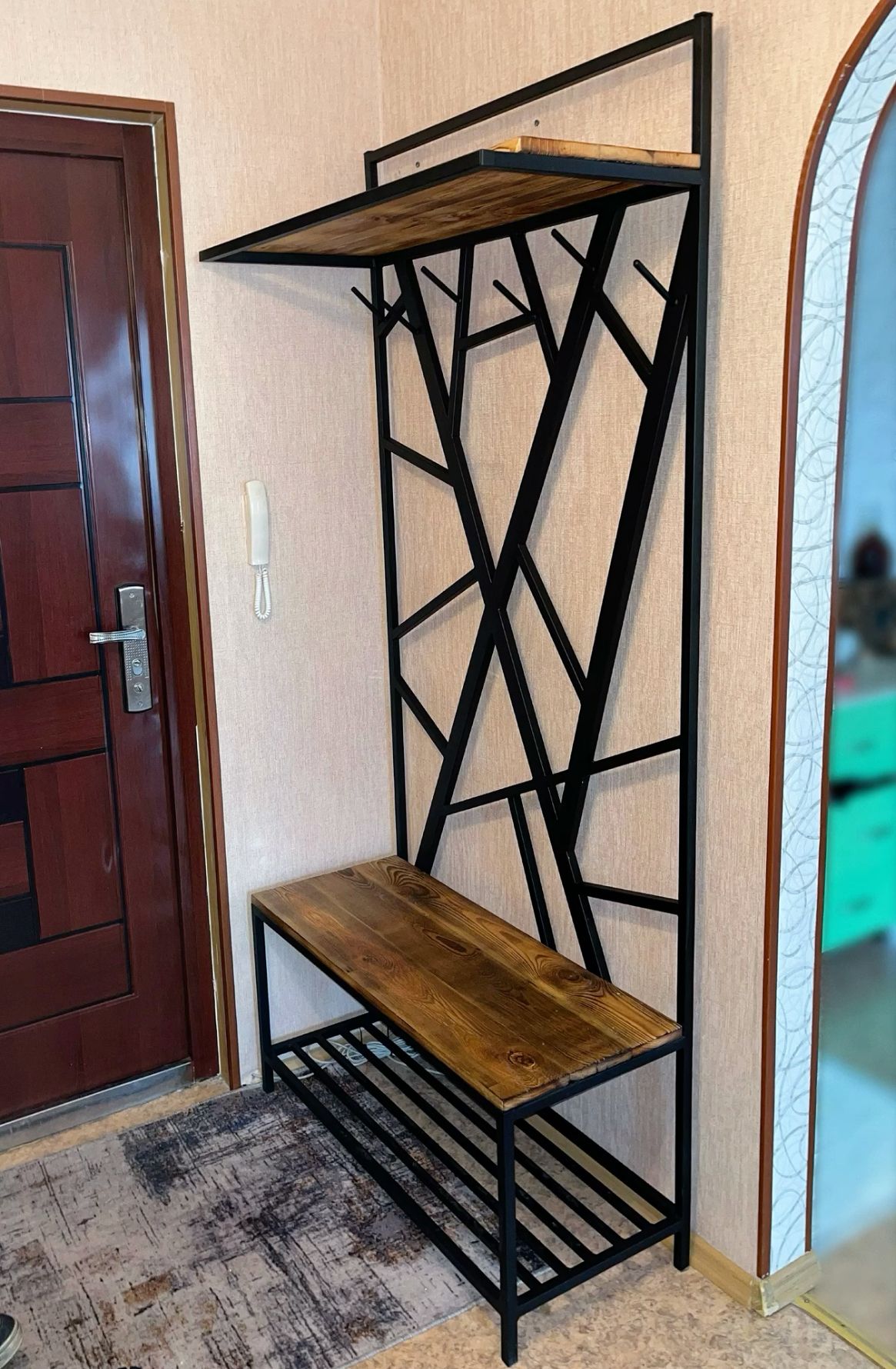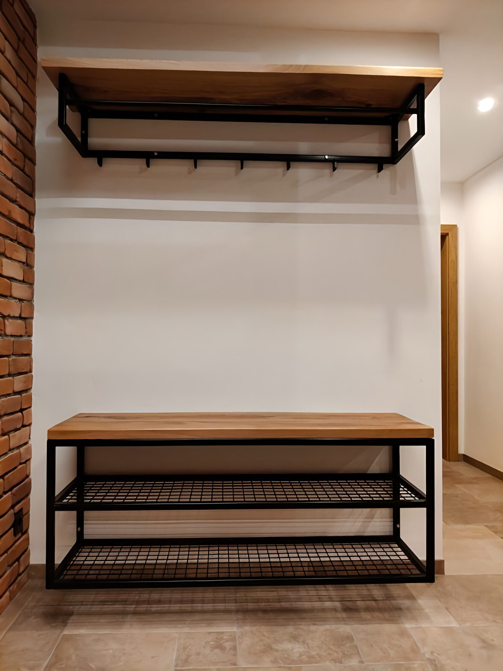 Обувница «Объем» изготовлена из металлического каркаса и натурального дерева. Детали качественно сварены и зачищены, швы визуально не просматриваются. Каркас покрыт порошковой краской повышенной прочности, устойчивой к внешнему воздействию. Детали тщательно зачищены и имеют гладкую поверхность.