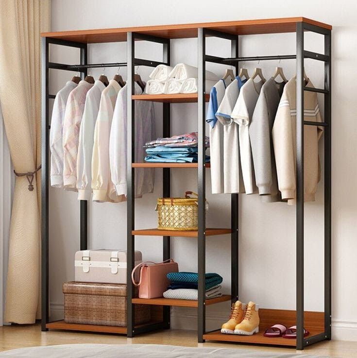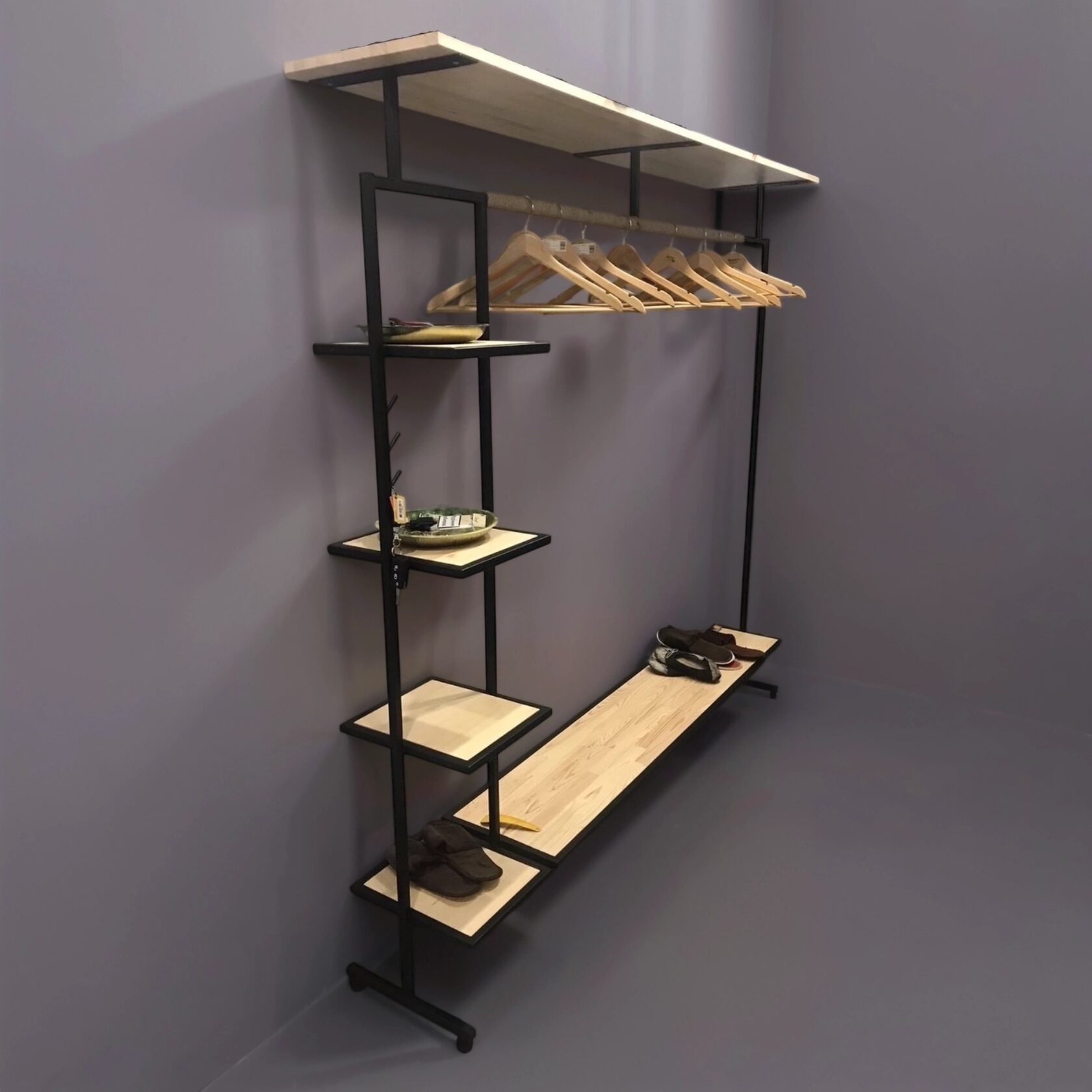 Гардеробная «Порядок» изготовлена из металлического каркаса и натурального дерева. Детали качественно сварены и зачищены, швы визуально не просматриваются. Каркас покрыт порошковой краской повышенной прочности, устойчивой к внешнему воздействию. Детали тщательно зачищены и имеют гладкую поверхность.