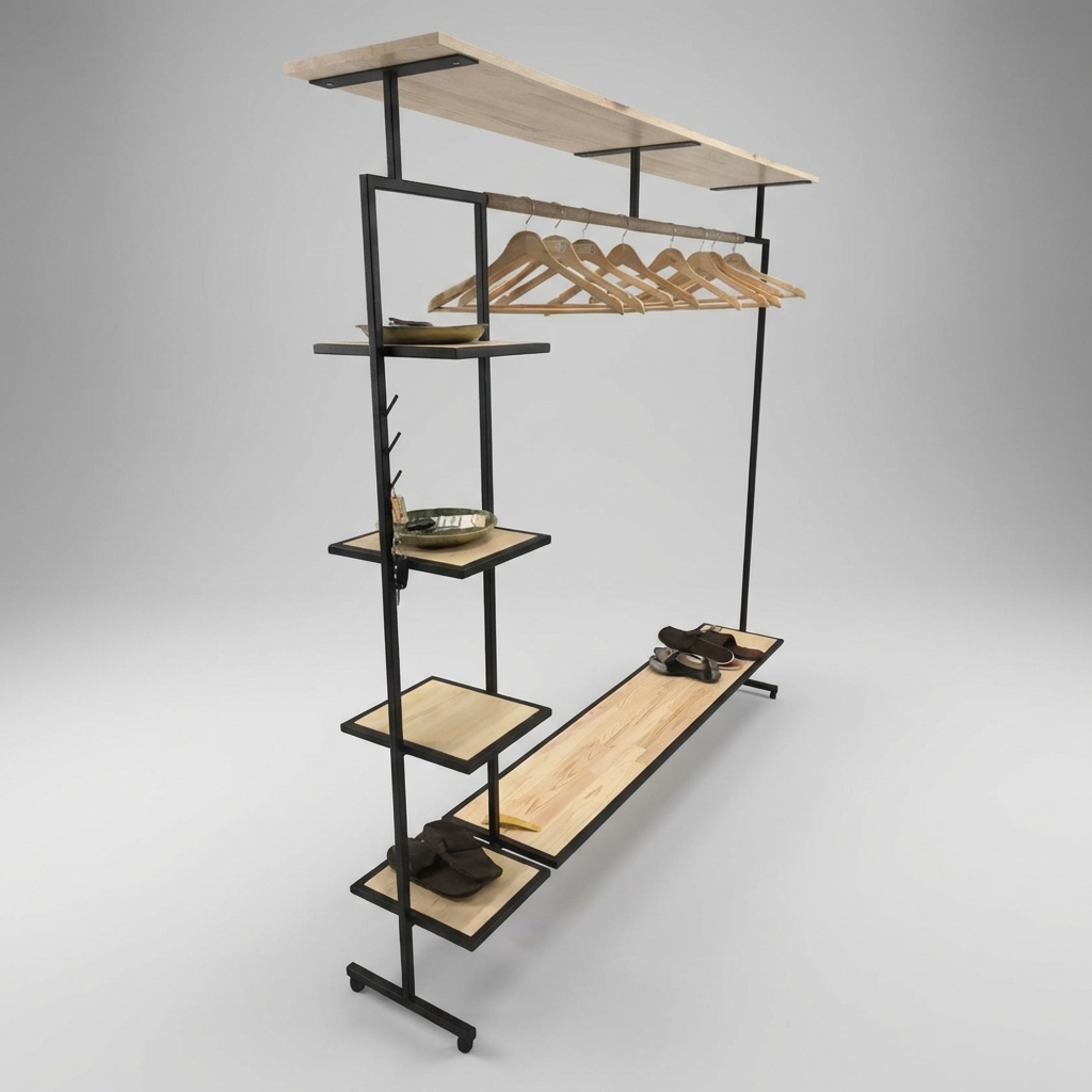 Гардеробная «Этаж» изготовлена из металлического каркаса и натурального дерева. Детали качественно сварены и зачищены, швы визуально не просматриваются. Каркас покрыт порошковой краской повышенной прочности, устойчивой к внешнему воздействию. Детали тщательно зачищены и имеют гладкую поверхность.